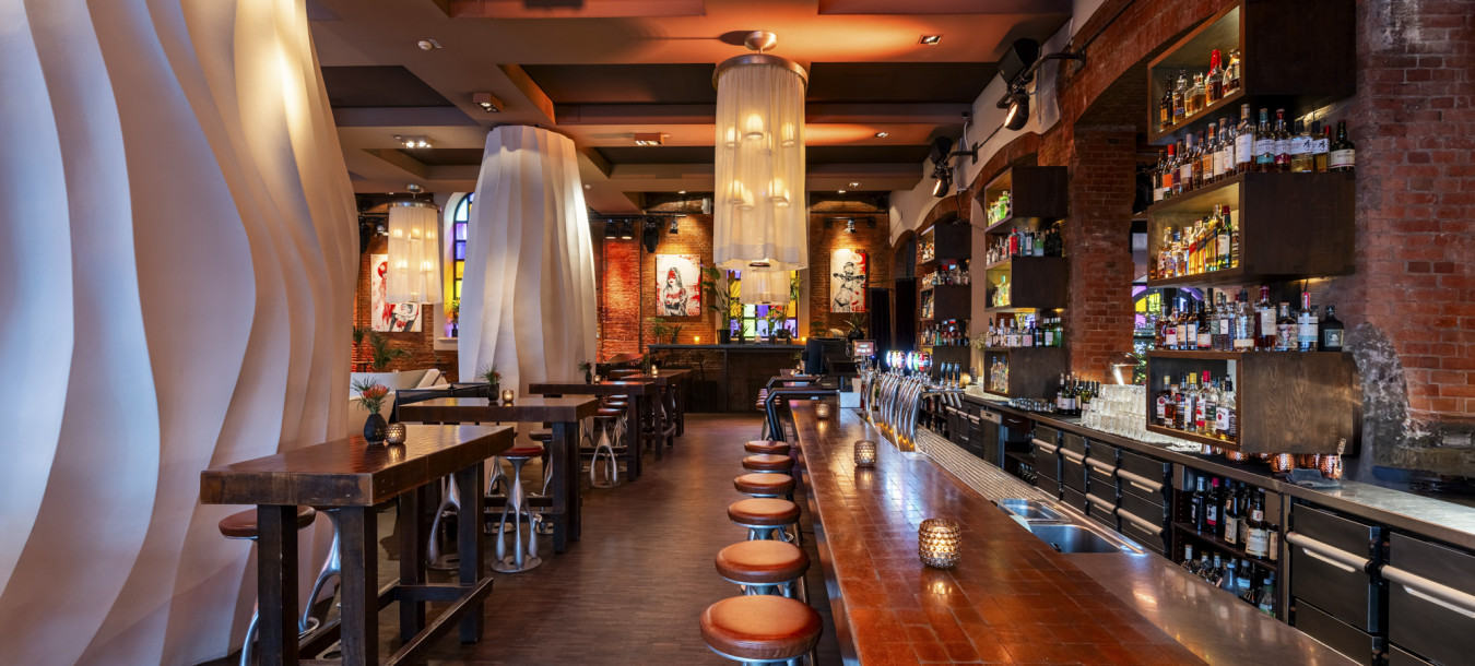 Die Yakshi`s Bar mit großzügigem Tresen schmiegt sich eng an die Säulenkomposition, welche das Wahrzeichen des east Restaurant darstellt.