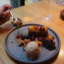 Den süßen Abschluss bildet ein Brownie-Karamell-Cake mit Mousse au Chocolat und Kaffee-Crème-Eis.